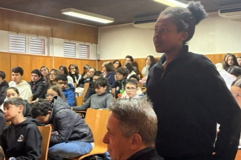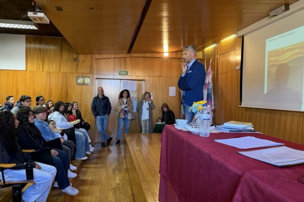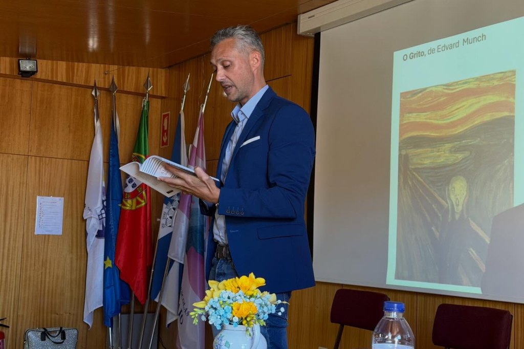 No quinto dia, foi a vez de José Alberto Postiga dinamizar uma nova sessão de “Histórias com Autor”, desta vez centrada na saúde mental. Com a participação dos alunos do 6.º D e do 7.º D, que apresentaram frases sobre o tema, e com O Grito, de Edvard Munch, como pano de fundo, construiu-se um ambiente de grande atenção, emoção e reflexão. O escritor sublinhou o poder da linguagem para nomear, compreender e iluminar a dor, destacando a importância de gostar de nós próprios e de saber habitar o mundo interior. O encontro terminou com a leitura de um poema de amor, após a curiosidade manifestada pelos alunos sobre essa vertente da sua escrita.