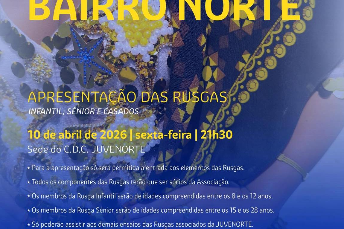 Na Sexta-feira, dia 10 de Abril, a partir das 21h30, a Juvenorte apresenta as Rusgas – Infantil, Sénior e Casados, que irão integrar a animação tradicional das Festas de São Pedro do Bairro Norte 2026 que se querem, uma vez mais, de Ouro sobre Azul e a tocar a perfeição.